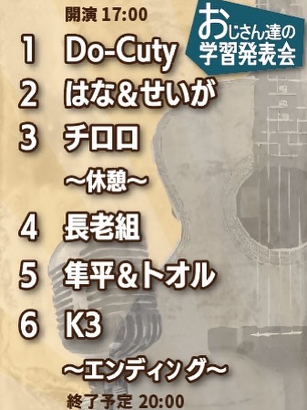 「おじさん達の学習発表会」明日9/27日(土)開演17時〜20時頃終了予定ゆいゆい国頭屋外ステージにて!応援よろしくお願いします!